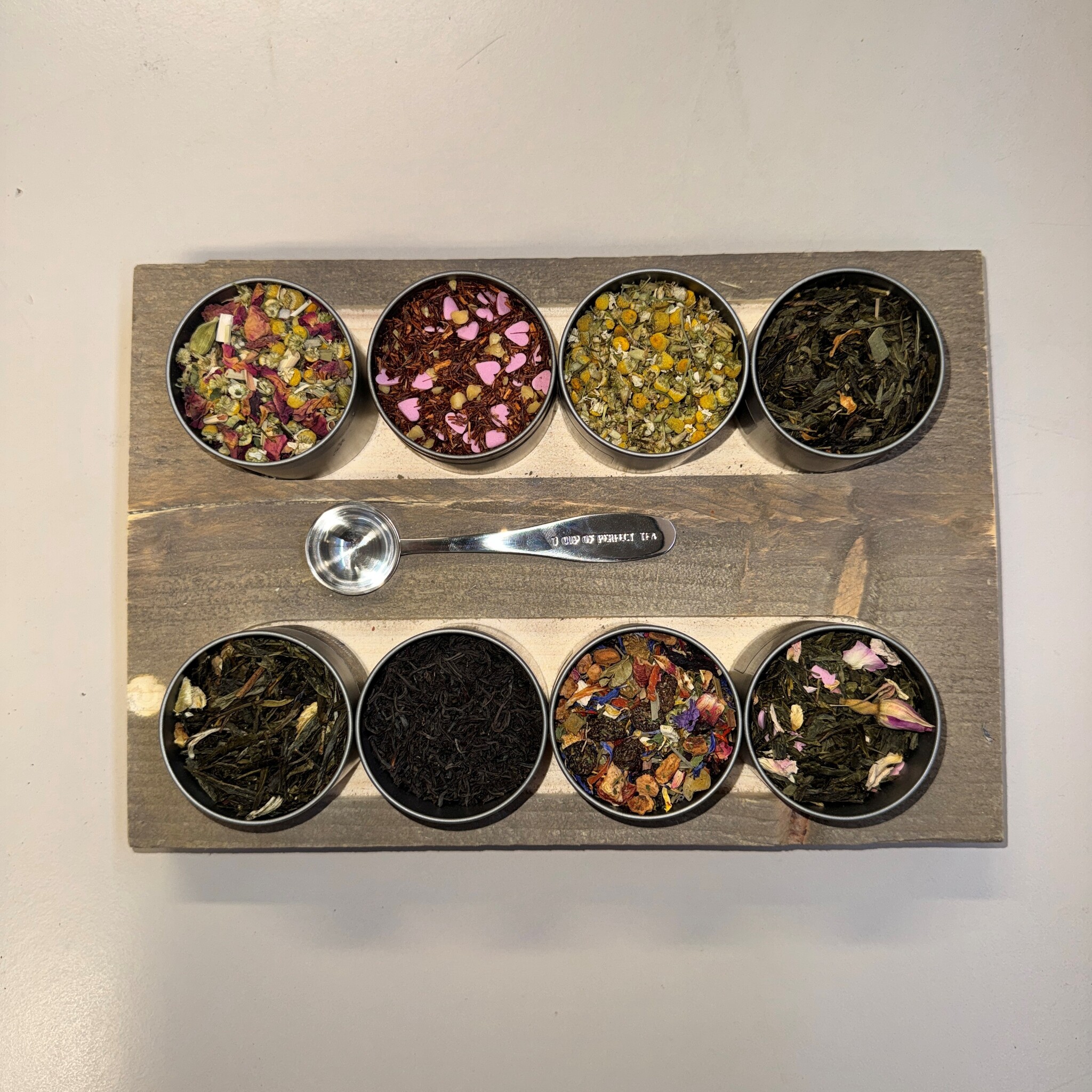 De theeplank wordt compleet geleverd en bevat 2 zwarte theesoorten, 2 kruiden- of vruchtentheesoorten, 2 rooibos theesoorten en 2 groene- en/of witte theesoorten. Wij zorgen voor een leuke afwisseling van smaken!