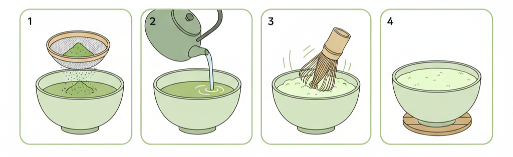 Een traditionele kop matcha maak je niet zomaar; daar heb je de juiste accessoires voor nodig. Eerst verwarm je water tot ongeveer 70 graden en zeef je een kleine hoeveelheid (1 a 2 gram) matcha poeder in een matcha kom (matcha bowl). Vervolgens klop je het met een bamboe matcha klopper (chasen) tot een schuimige, luchtige thee. Dit ritueel zorgt niet alleen voor de perfecte smaak, maar maakt het drinken van matcha ook tot een moment van rust en aandacht.