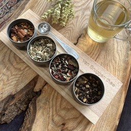 Deze mooie beukenhouten theeplank biedt ruimte aan 4 ronde blikjes met transparante deksel.