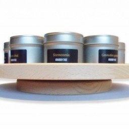 Deze mooie beukenhouten theeroulette biedt ruimte aan 8 ronde blikjes met transparante deksel.