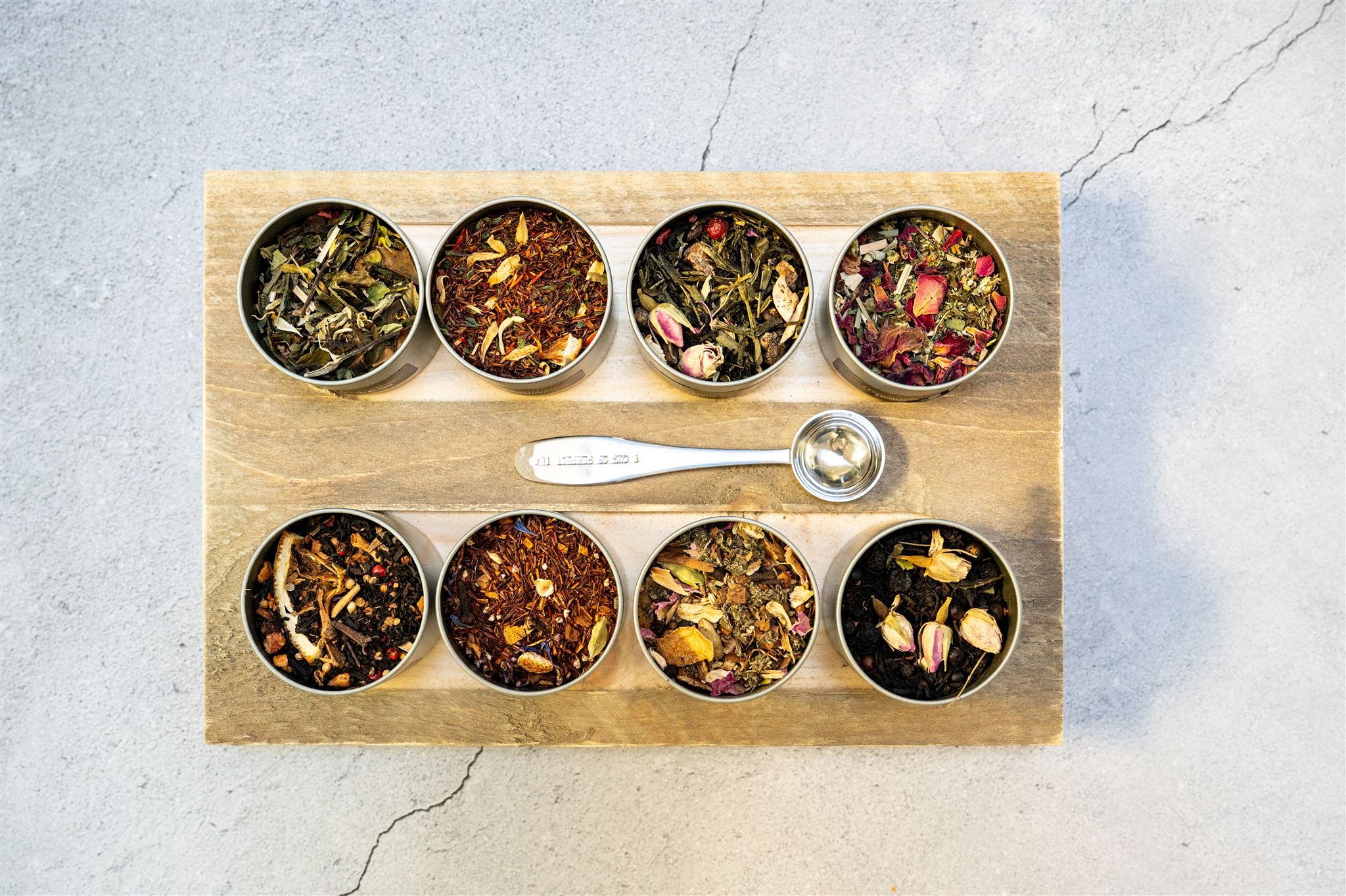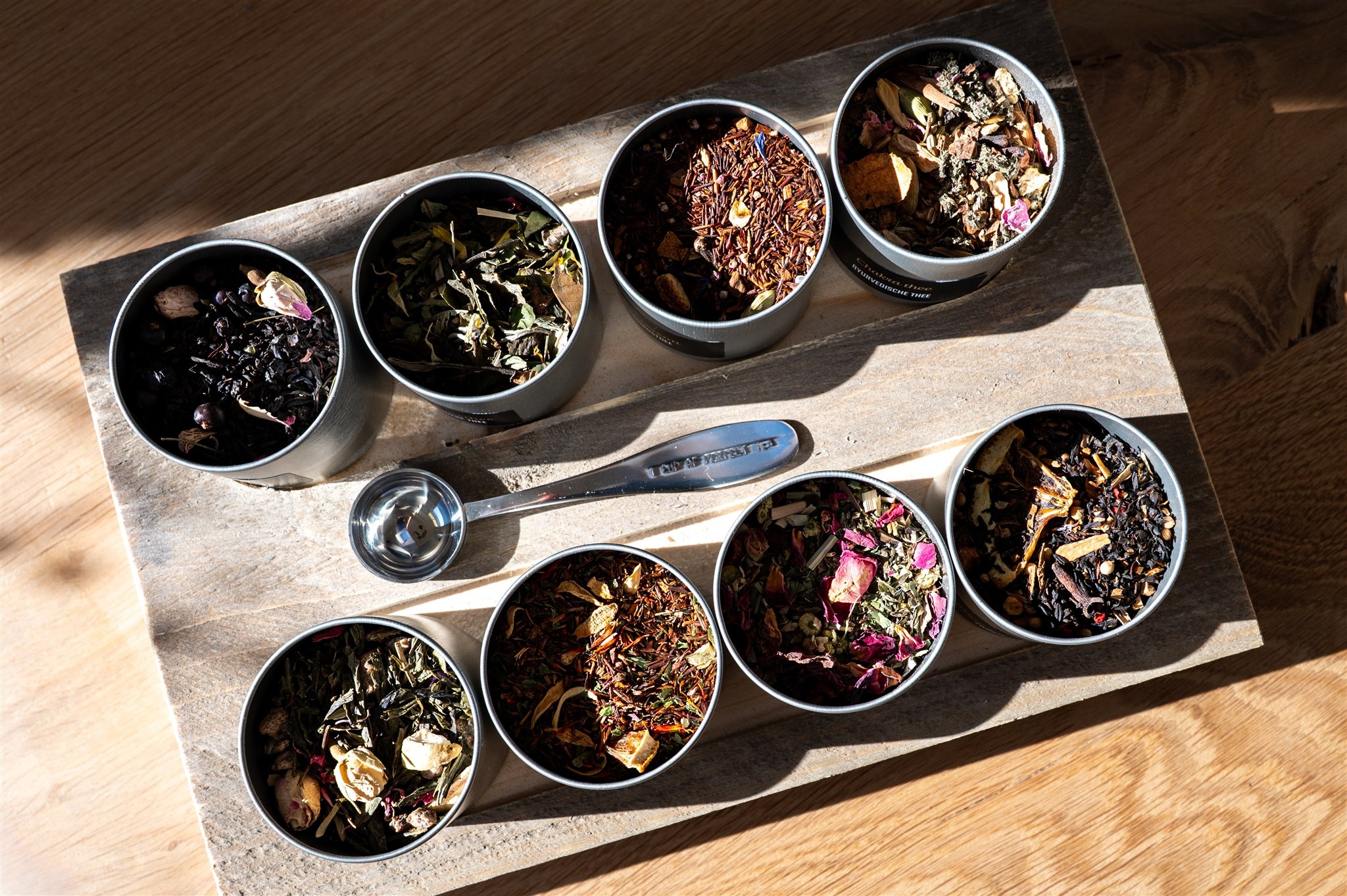 De theeplank bevat standaard 2 zwarte theesoorten, 2 kruiden- of vruchtentheesoorten, 2 rooibos theesoorten en 2 groene- en/of witte theesoorten. Wij zorgen voor een leuke afwisseling van smaken!